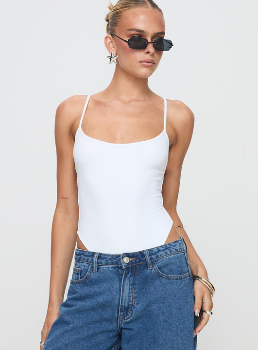 - Scoop neckline, press clip button closure at base, g-string bottoms, high-cut leg, strappy back detail