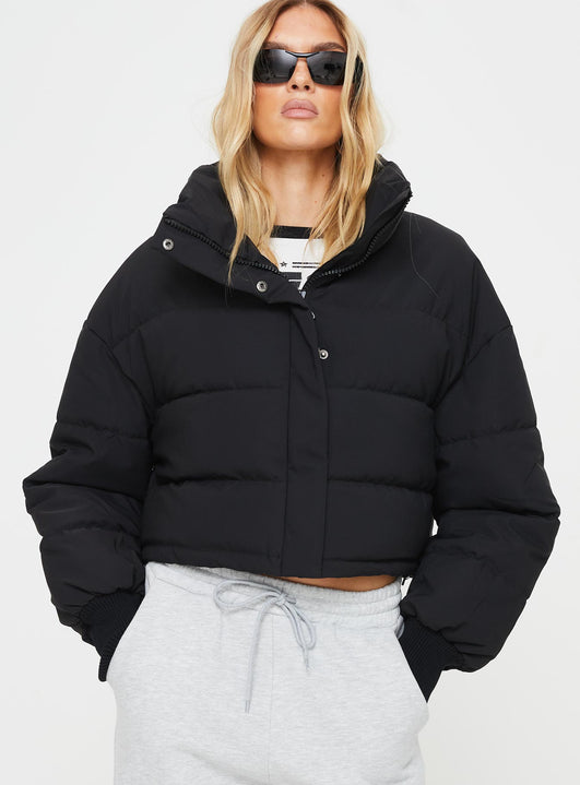 - Snap button fastening at front, mock neck, ribbed cuffs, adjustable drawstring around waist
