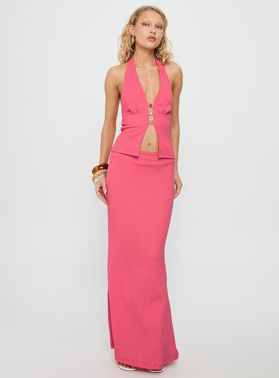 - Ruched bust, split hem, elasticated halter strap, partially open back, mid-rise maxi skirt , elasticated waistband, pocketless, textured fabric