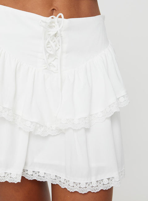 front view of model wearing Princess Polly Capshaw Mini Skirt White Mini Skirts