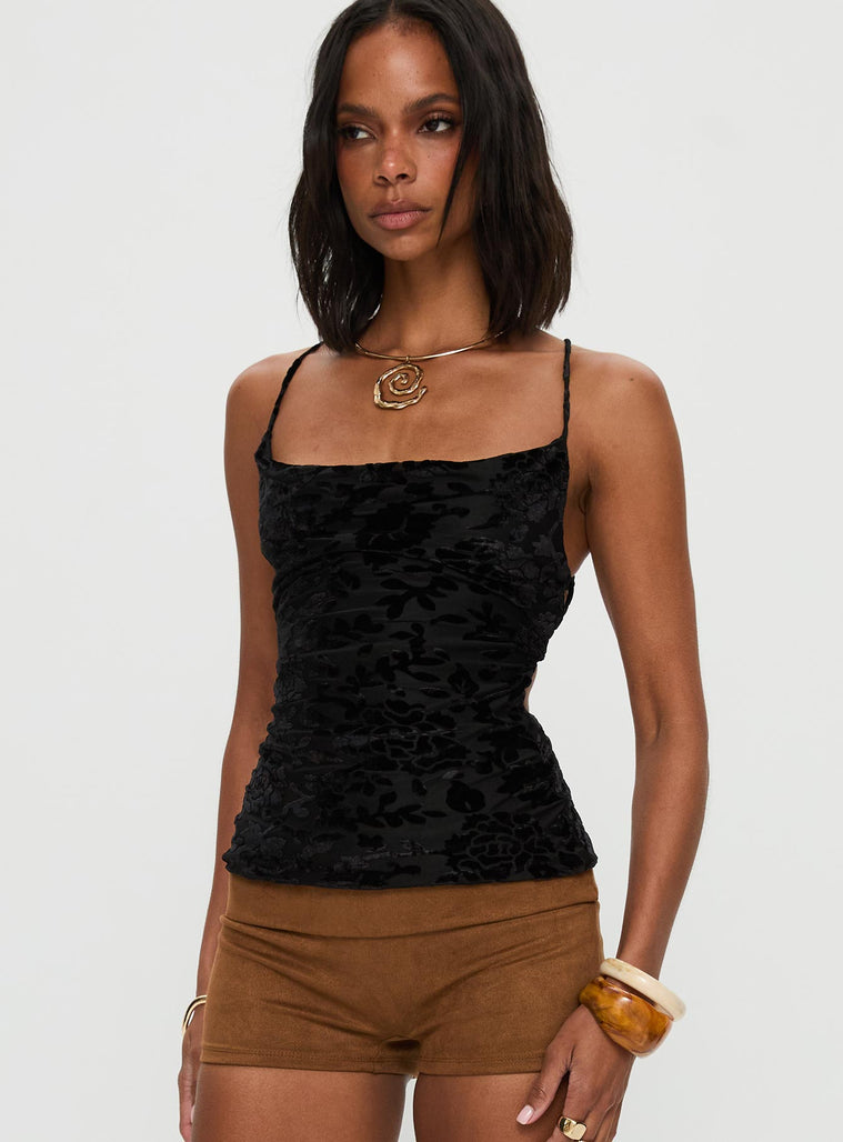 - Halter top, cowl neckline, floral textured material, open back with cross strap detail, tie fastening
