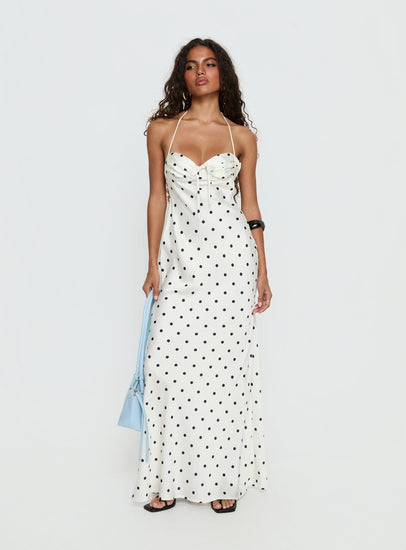 Costella halter satin maxi dress cream polka dot