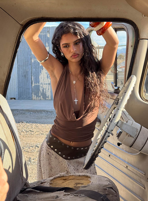 - Asymmetrical midi skirt with studded detail