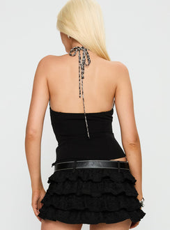 - Halter style, leopard print bust, block coloured bodice, v-neckline, duel tie fastening at neck, partial open back, invisible zip fastening at side, elasticated band at back