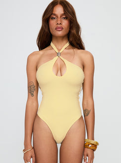 - Ribbed, cut-out detail, press clip buttons at base, high-cut leg, cheeky bottoms, fixed halter
