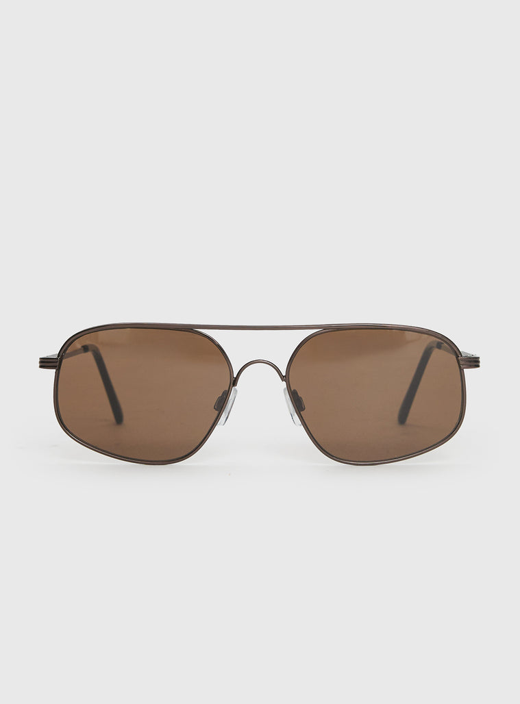 - Brown tinted lenses, bronze frame, adjustable silicon nose pads, slim metal arms