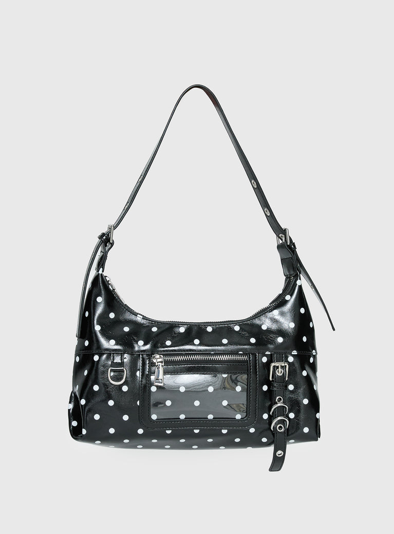 - Polka-dot print, single strap with adjustable strap, silver-toned hardware, internal pockets, bucket detail
