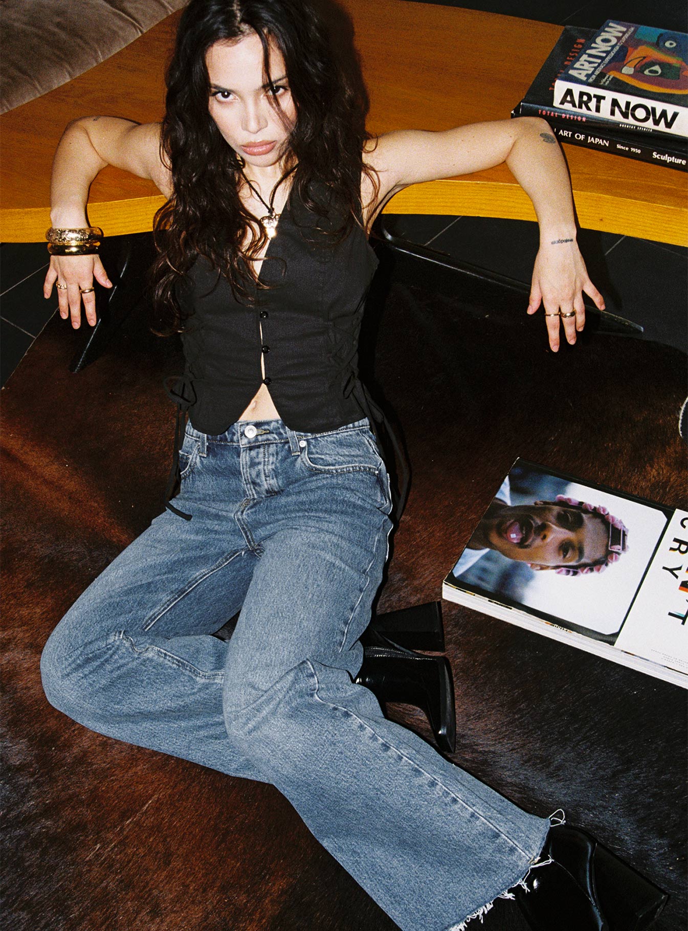 - Dark washed, belt looped waist, five pockets, button & zip closure, raw edge hem, branded patch at back