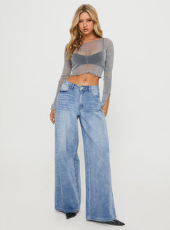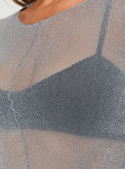 - Sheer silver material, crop style, exposed stitching detail, lettuce edge hem, split at sleeve cuff