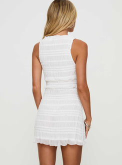 - High neckline, semi-sheer, textured material, ruched, sleeveless