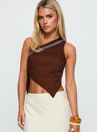 - Linen blend material, embroidered detail, tie fastening at back, asymmetrical hem