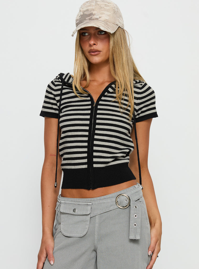 - Zip closure, drawstring at hood detail, fitted waist, cap sleeves