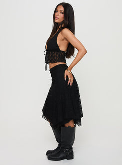 - Halter top, plunge neckline, front tie detail, split hem, asymmetrical midi skirt, invisible zipper on side, mid-rise fit