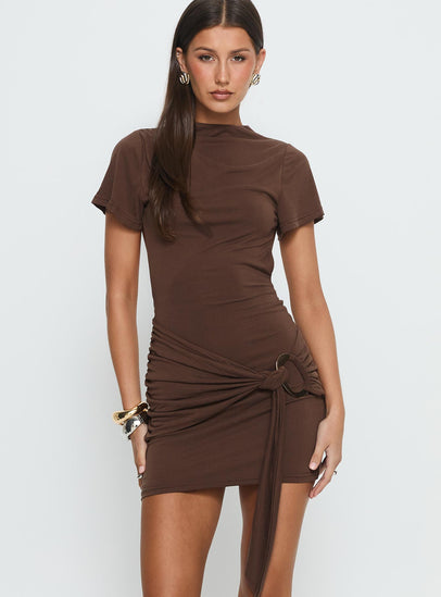 - Ruched at shoulder, wrap-around detail with ring detail, cap sleeves, open back