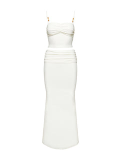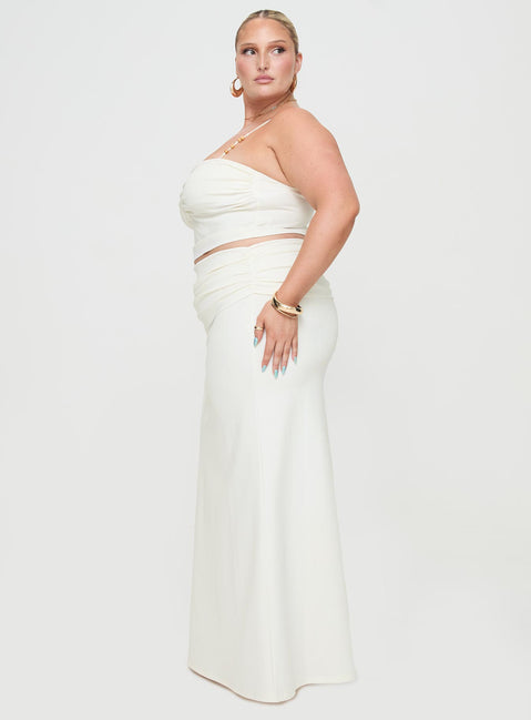 - Mid rise maxi skirt, folded waistband, ruching at sides