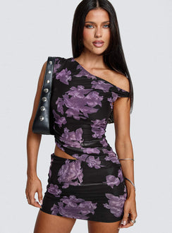 - One off shoulder top , ruched, asymmetrical hem, mid-rise mini skirt , elasticated waist