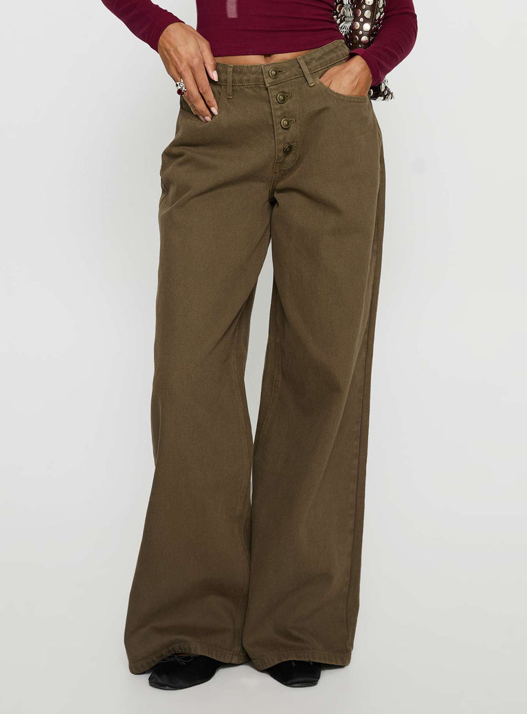 front view of model wearing Princess Polly Naylor Mid Rise Wide Leg Jeans Olive High Rise Jeans