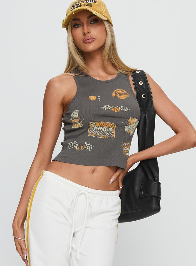 - Ribbed, graphic print detail, raw edge hem, sleeveless, cropped