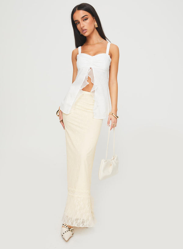 - Elasticated shoulder straps, sweetheart neckline, split hem at front with sheer ruffle detailing, gathered ruched detailing at bust