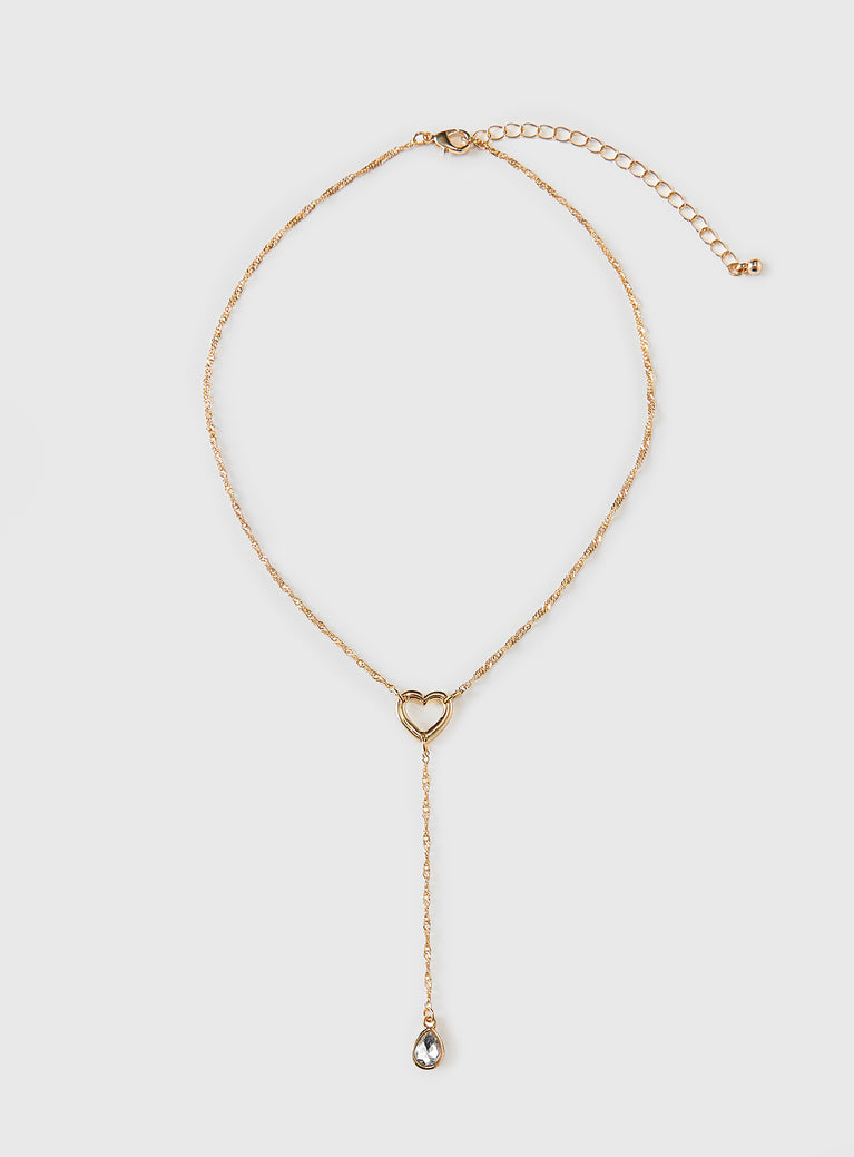 - Gold toned, heart pendent, jewell embellishment, lobster claw fastening at back
