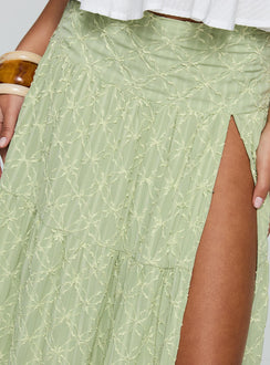 - High leg split, tiered hem, invisible zip closure at side, textured material