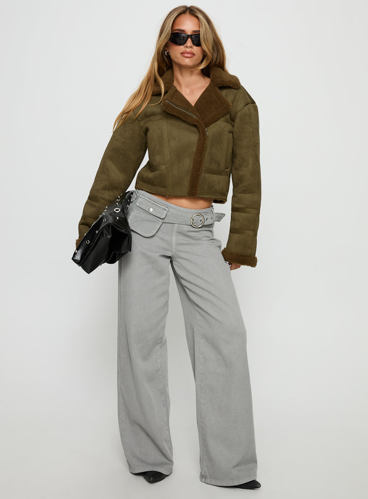- Lapel collar, zip collar, twin front pockets, drop shoulders, shearling detail
