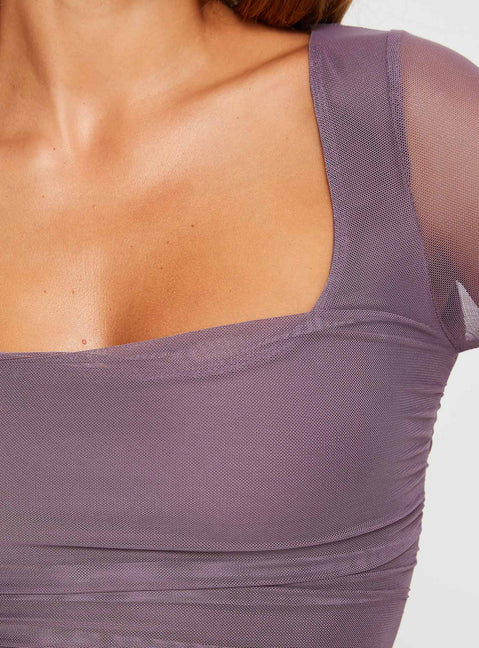- Slim fitting, mesh material, square neckline, ruched design