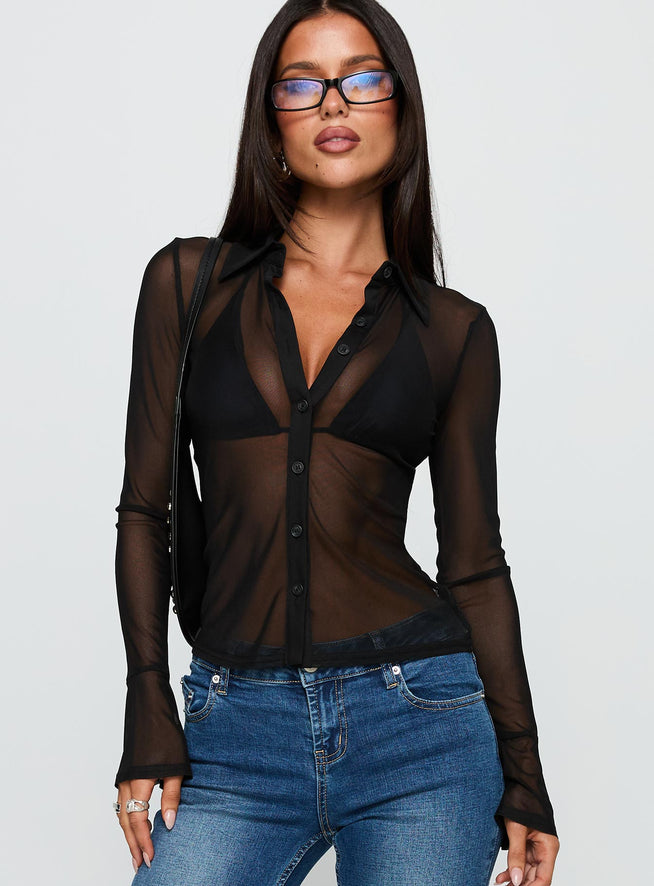 - Long sleeve, sheer, button up, classic collar, flared cuff with split
