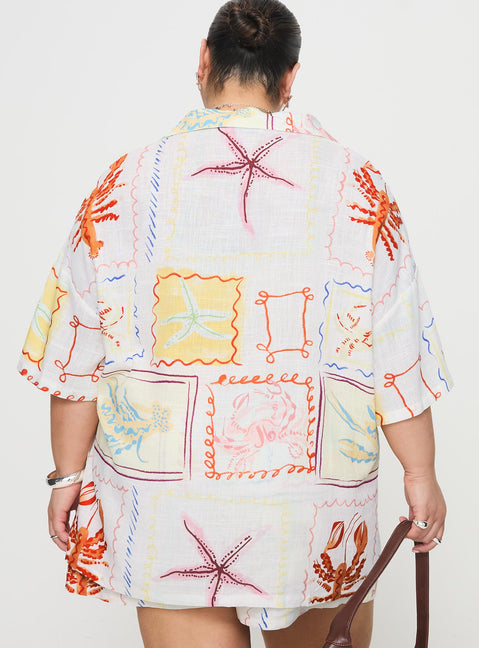 - Classic collar, button-up closure, drop shoulders, mid-rise fit shorts, elasticated waistband, twin hip pockets, oversized