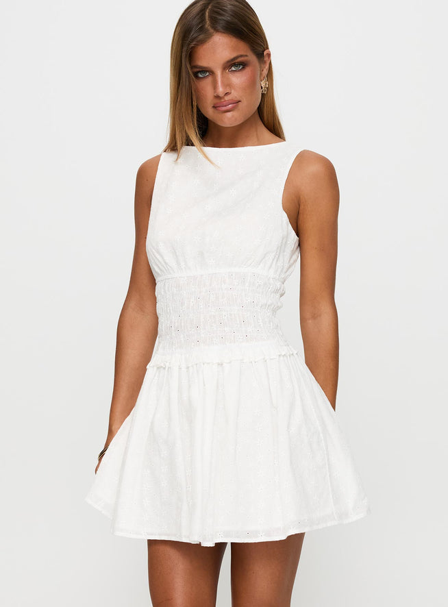 front view of model wearing Princess Polly Yennifer Shirred Broiderie Mini Dress White Crew Neck