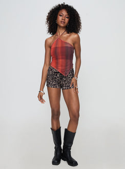 - Ombre print, asymmetrical hem, adjustable halter straps, low back